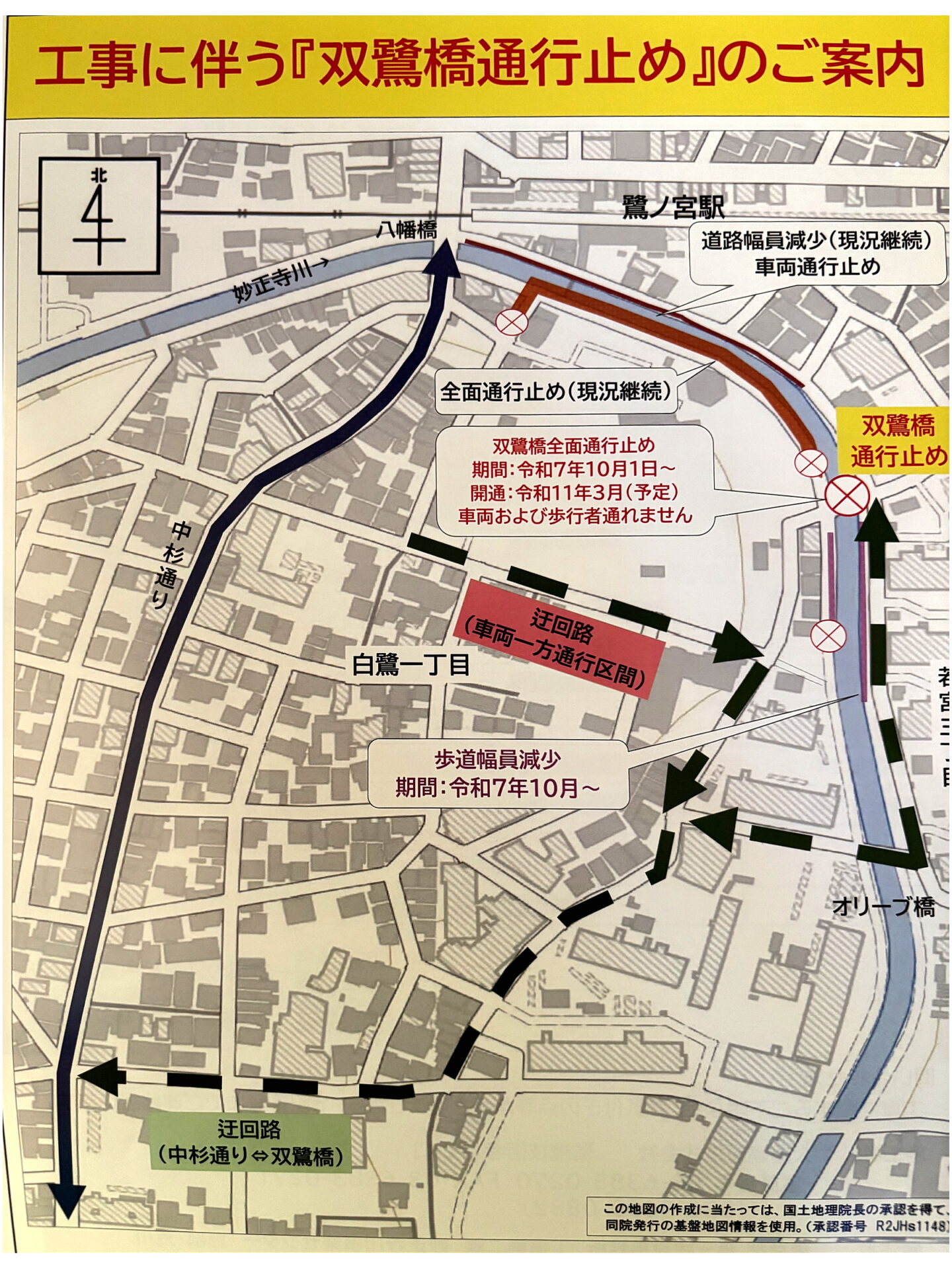 上記の施工に伴い2025年10月1日より「双鷺橋の全面通行止め」および「双鷺橋~オリーブ橋間の幅員減少」