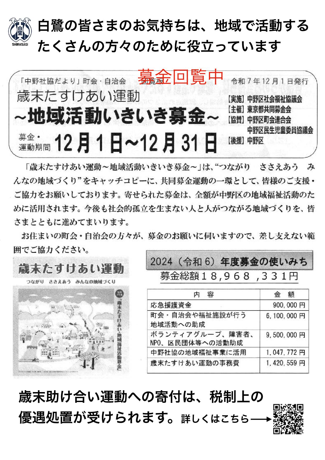募金等 連絡・お知らせ 町会員へのお知らせ 寄付関係 「歳末助け合い運動・募金のお願い」について 町会事務局 2025年12月9日 助け合い運動・募金は、地域で活動するたくさんの方々のために役立っています。 ご支援をお願い致します。 ▼ PDFファイルダウンロード(676KB)