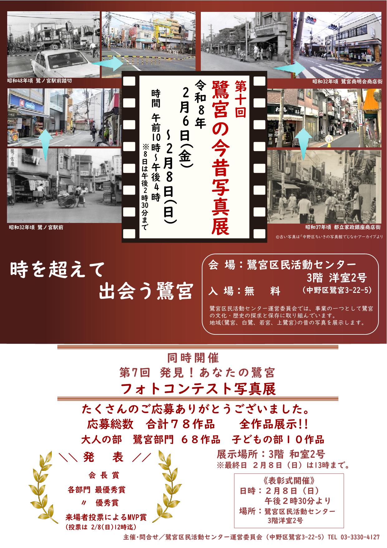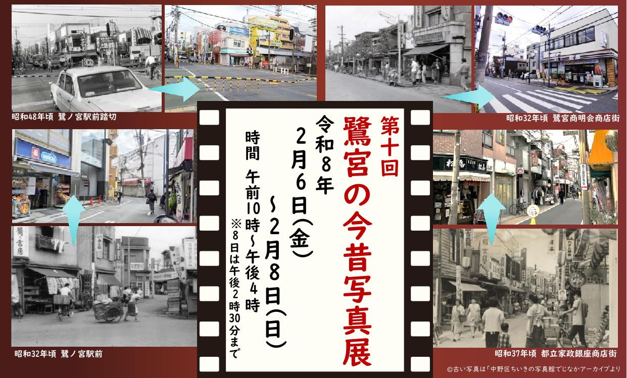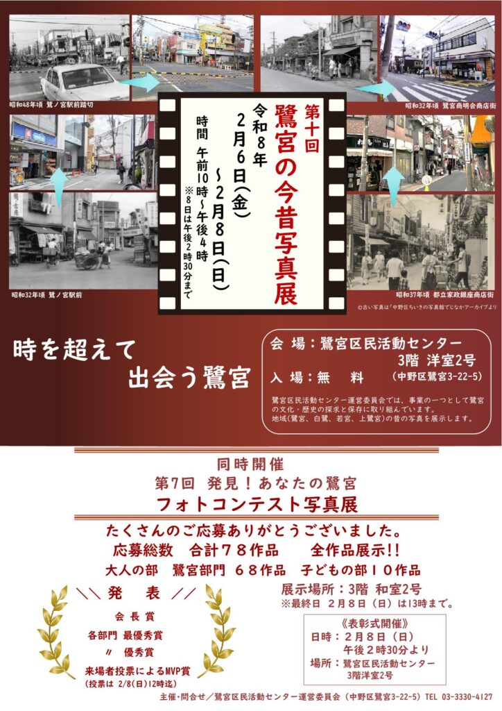 行事関係 第10回 鷺宮の今昔写真展・開催のご案内(2025/2/6~8) 町会事務局 2025年12月18日 以下にて開催されます。 日時: 令和8年2月6日(金)~2月8日(日) 午前10時~午後4時 (8日は午後2時30分まで) 場所: 鷺宮区民活動センター 3F 洋室2号 (中野区鷺宮3-22-5) 入場無料 「第7回 発見!あなたの鷺宮 フォトコンテスト写真展」同時開催 【PDFファイルダウンロード】