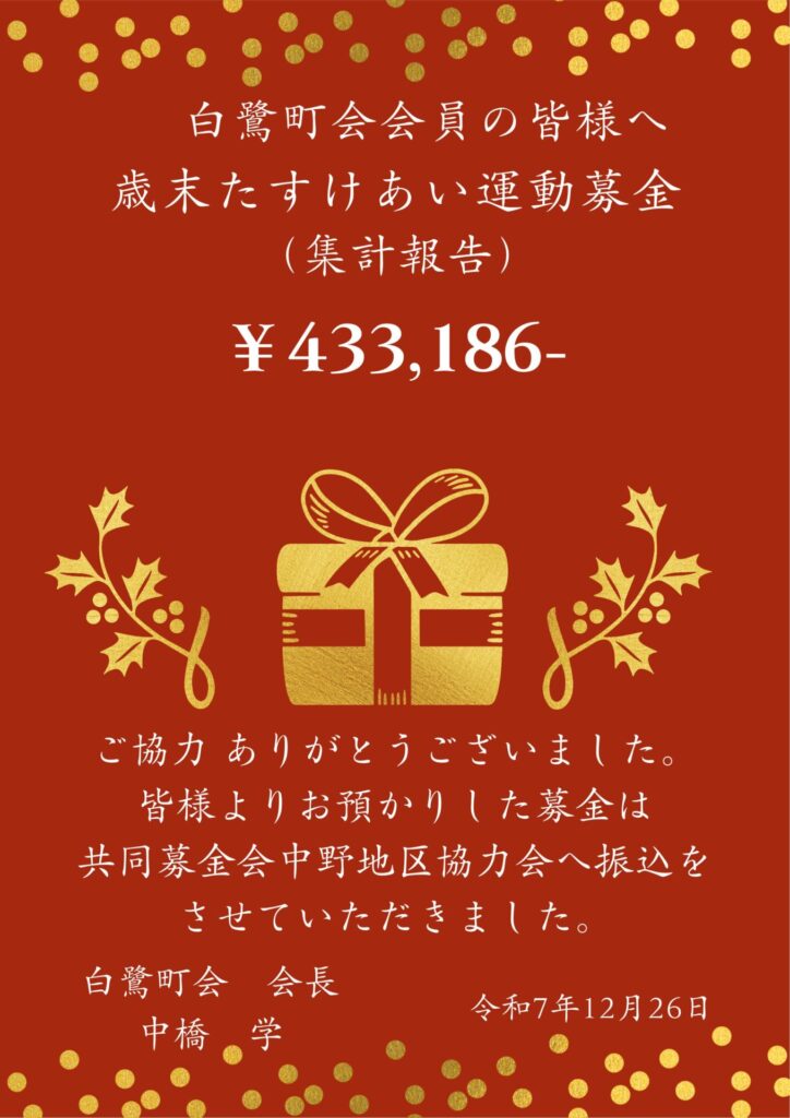 皆様よりお預かりした募金は、共同募金会中野地区協力会へ振り込みいたしました。