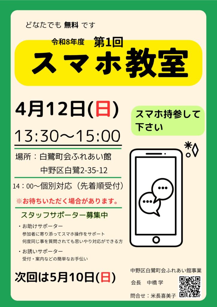 町会行事 行事関係 2026年4月度 「スマホ教室」開催のお知らせ 町会事務局 2026年3月22日 日時: 4月12日(日) 13:30~15:00 場所: 白鷺町会ふれあい館 【PDFファイルダウンロード】