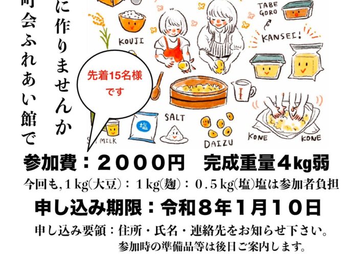 令和8年 「味噌づくり会」を開催します。 日時:1…